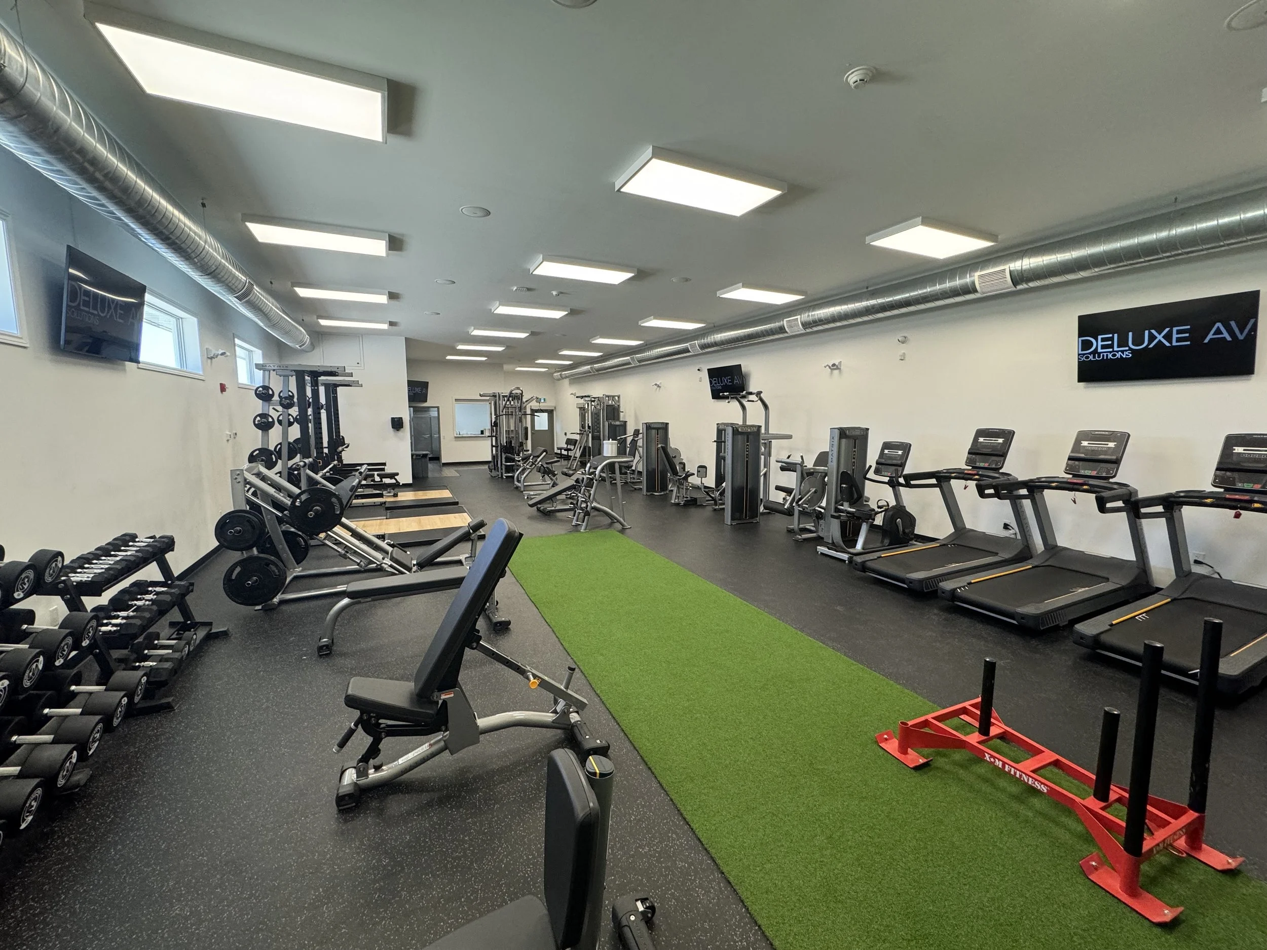 Installing sound systems and TVs in a gym balances functionality and aesthetics for a motivating atmosphere. Speakers are strategically positioned allowing members to enjoy music at a comfortable volume. High-resolution TVs ensure clear visibility of important announcements and news without obstructing spaces. This system is fully integrated on the RTI platform allowing full control from a simple wall touch panel.
